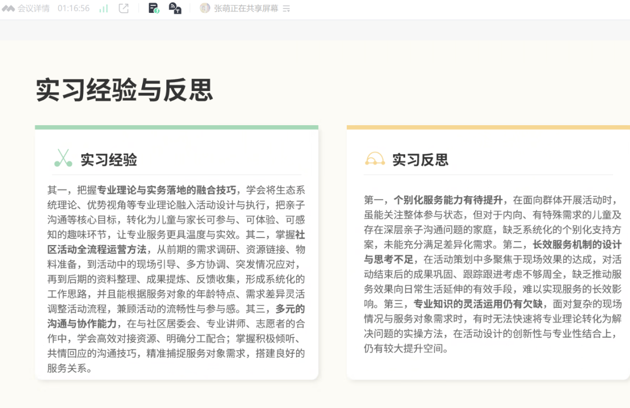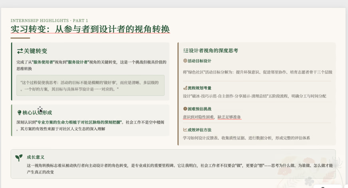 房山区农村社会工作人才培养项目开展需求评估、青少年个案介入、儿童小组与社区活动策划执行,强调专业服务应根植真实需求,并在反思中明确需进一步提升危机介入与复杂个案处理能力;张驰同学在社区服务中心围绕代际服务项目、青少年志愿服务体系与社区宣传倡导等工作逐步从观察融入走向深化实操,并通过参与CSS社会调查培训与巡视工作提升了团队协作和应急能力,进一步认识到在陌生社区建立信任关系与提升冲突应对能力的重要性。