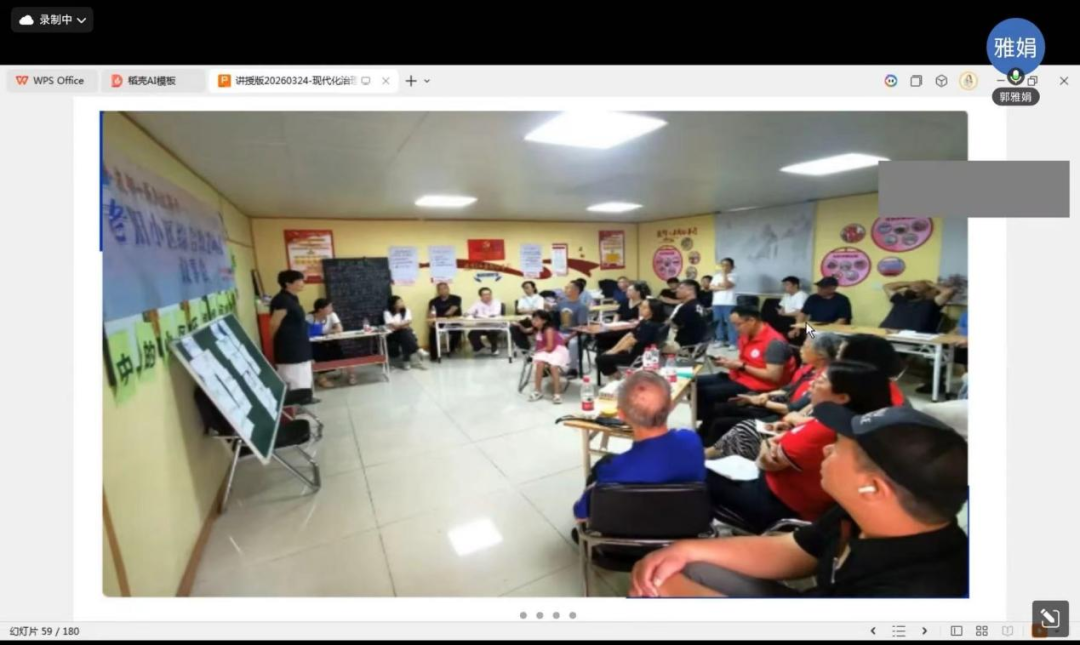 第二场讲座,郭雅娟老师从国家治理现代化的宏观背景谈起,阐明了议事协商是全过程人民民主在基层的生动实践。郭老师提出,现代社区治理已从社会管理转向社会治理,关键要以党建为引领,依托五社联动机制,吸纳两企三新等多元力量,实现共建共治共享。她还强调,议事协商不只是解决问题的手段,更是通过大家理性商量凝聚社区共识、筑牢彼此信任的重要途径,这一理念的深化也与政策发展一脉相承。